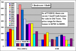 Six, 2bed/1bath single family homes have sold in Old Town thru June 30, 2012 with an average sales price of $370,000, up 11% over 2011. This is the first price increase since 2005 and reflects a bottoming of the market. The price per sqft of $363 is the same as 2011 and parallels the bottoming of sales prices. But, the 2bed/1bath category has averaged nineteen sales per year since 2008 so closing only six sales thru June 30th is worrisome.