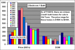 Only two, 1bed/1bath single family homes have sold in Old Town thru June 30, 2012, a major decline in the “under $500K” category. This is due to a shortage of well-priced small homes as many were purchased during the run-up in prices 2002 – 2004 and converted to 2 bedroom homes. Foreclosure and short sales are disappearing and many small home buyers are opting to buy Mid-Town or rent.