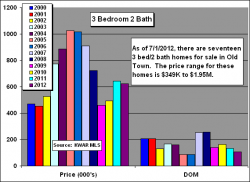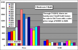 FIFTEEN, 3bed/3bath single family homes have sold in Old Town thru June 30, 2012 at an average sales price of $941,000, up 4% over 2011. Fifteen is the highest number of 3bed/3bath sold since tracking began in 2000. Also, the sales price and the price per sqft of $507 are the HIGHEST since 2005.
