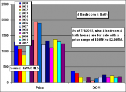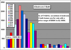 Only two, 4bed/4bath single family homes have sold in Old Town thru June 30, 2012, at an average sales price of $1,240,000, down 6% from 2011. The price per sqft of $496 was also down, 20%, from 2011. Prices for these larger homes have been stuck in a range between $1.38M to $1.11M since 2007.
