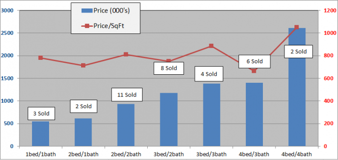 The seven bed/bath combinations below contain enough sales to measure and evaluate trends after the 2004-2006 real estate Bubble.