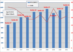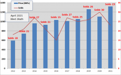 Thirty-eight single family homes sold in the Old Town Key West area in April, the most EVER for a single month. This brings the total number of sales thru April to 109 sales. In 2019 there were 144 sales. In 2020 there were 142 sales. The 107 sales thru April equates to 75% of the last two years' annual sales in 33% of the time. Wow. On Prices, the average sale price in April was $1.411M with a median of $1.188M. The average sales price per square foot for April was $878, bringing the Jan - April average to $874 per sqft, which is 16% above the 5-year (2016 - 2020) Jan - April average and up 13% from the end of 2020.