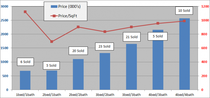 The seven bed/bath combinations below contain enough sales to measure and evaluate trends after the 2004-2006 real estate Bubble.